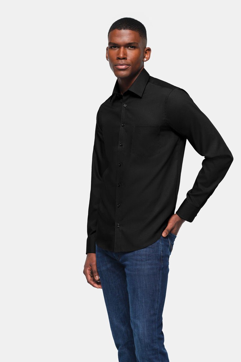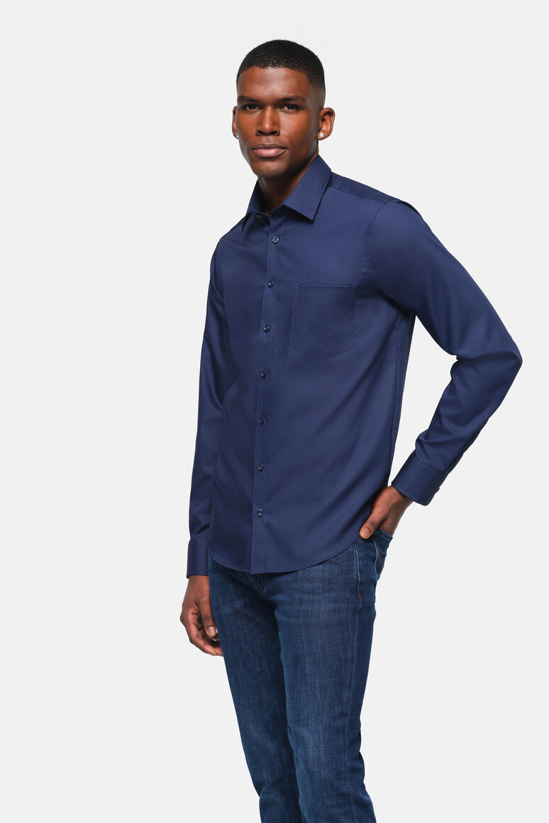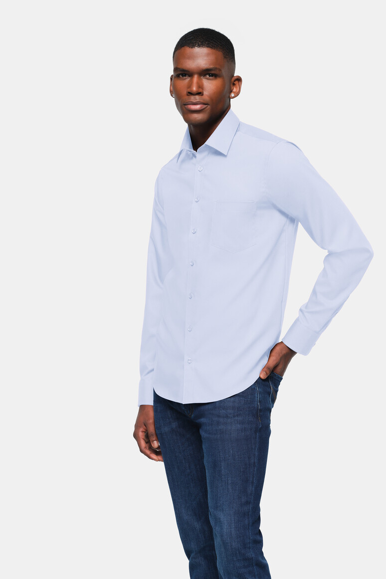 Klassisches Hemd mit Kent-Kragen und aufgesetzter Brusttasche. Knöpfe Ton in Ton (Farbe Himmelblau: Knöpfe in Farbe Weiß), Paspel aus dunkelblauem Satin an der inneren Kragennaht, eingearbeitete Kragenstäbchen, doppelte Schulterpasse, weitenverstellbare Manschetten und leicht gerundeter Saum. Formstabiler, strapazierfähiger und bügelfreier Baumwoll-Popeline. Verfügbar auch als Damenmodell. Lockere Passform: Comfort Fit.