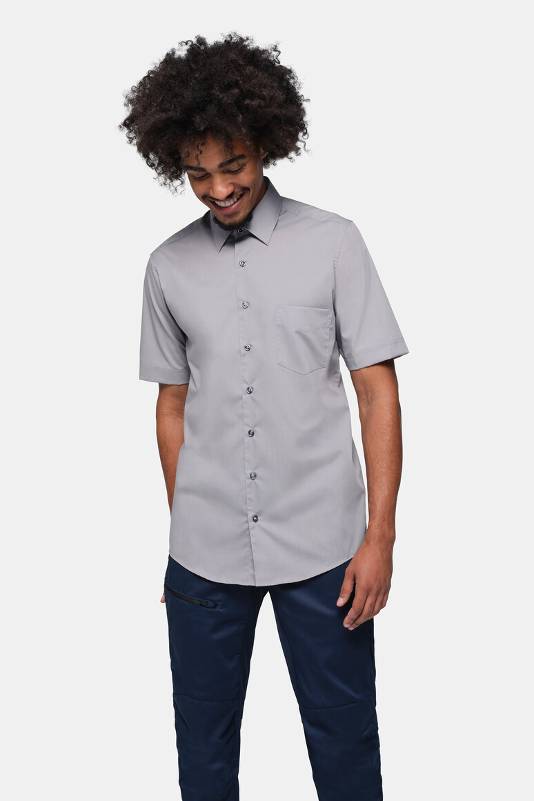 Besonders strapazierfähiges Kurzarm-Hemd mit Kent-Kragen und aufgesetzter Brusttasche. Knöpfe Ton in Ton, eingearbeitete Kragenstäbchen, Doppelkappnaht an den Seitennähten, weitenverstellbare Manschetten und leicht gerundeter Saum. Besonders pflegeleichtes und funktionelles Gewebe aus MIKRALINAR®, dem HAKRO Performance-Materialmix aus Baumwolle und Polyester. Verfügbar auch als Damenmodell. Lockere Passform: Comfort Fit.